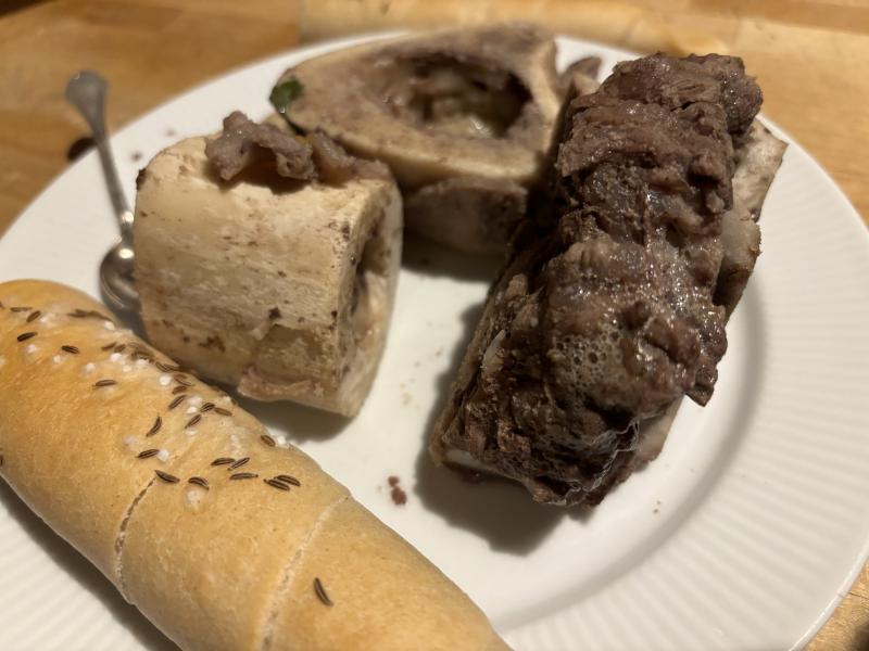 Ich hab Samstag Rindssuppe gekocht mit Markknochen, die gabs zuerst.