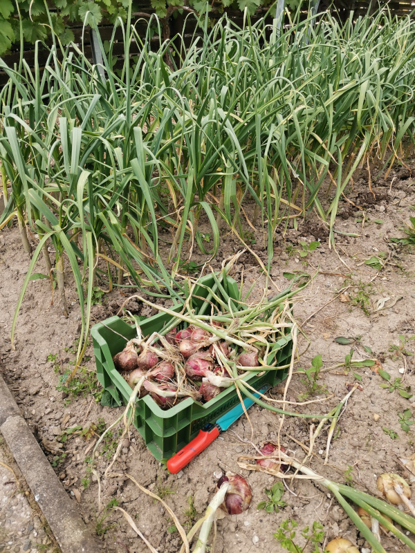 Die ersten Zwiebeln sind soweit. In der Kiste ist eine Reihe rote.