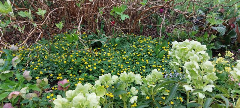 Unter einer uralten Eichenblättrigen Hortensie mit vielen Ausläufern will selbst der Giersch nicht wachsen. Ungeplant aber scheint sich hier gefülltes Scharbockskraut wohlzufühlen und auszubreiten. Soll es die ganze Fläche bedecken!!!