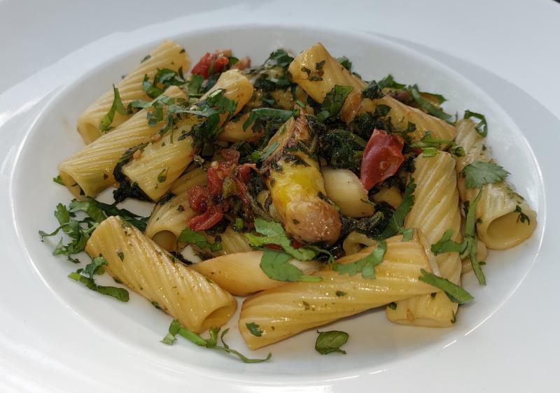 Pasta mit gebratenen Parasolen in einer Tomaten-Spinat-Soße mit Graviera und frischem Koriander und Winterheckenzwiebeln