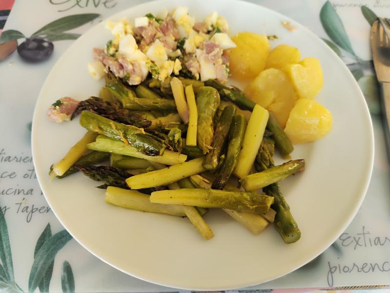 Gartenspargel im Ofen geschmort (Olivenöl, S+P, Zitronenzesten), Salzkartoffeln und Dip aus gehackten Eiern, feingewiegtem Oldenburger Schinken, Zwiebelröhrchen, etwas Essig und Öl.