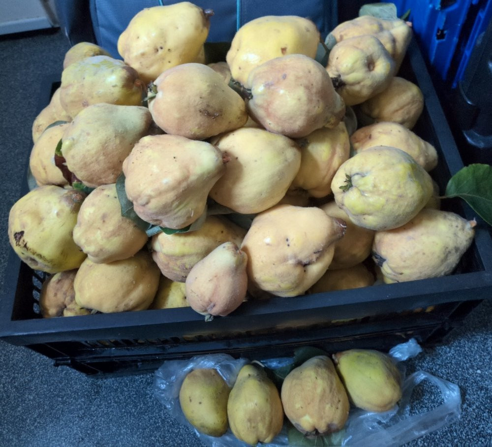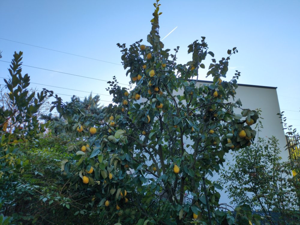 Quittenernte Teil 1. Nachdem wir unseren Einkaufswagen voll gepflückt hatten, hab ich ein Foto vom Baum gemacht. Man sieht gar nicht, dass etwas fehlt.