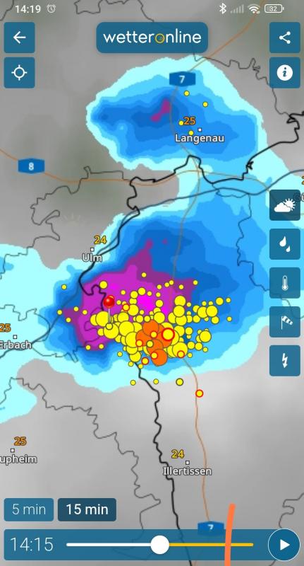 Ansonste bleibt abzuwarten was noch nach kommt. Um 13 Uhr waren nur ein paar Regenwölkchen auf dem Radar, Jetzt hat sich am Albaufstieg eine kräftige Kette von Gewittern aufgebaut. Warten wir mal ab, mehr kann man eh ned tun.