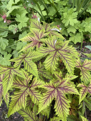 Die Blätter von Filipendula 'Red Umbrellas' , eine japanische Kreuzung von Filipendula multijuga und Filipendula palmata. Braucht feuchtem Boden!