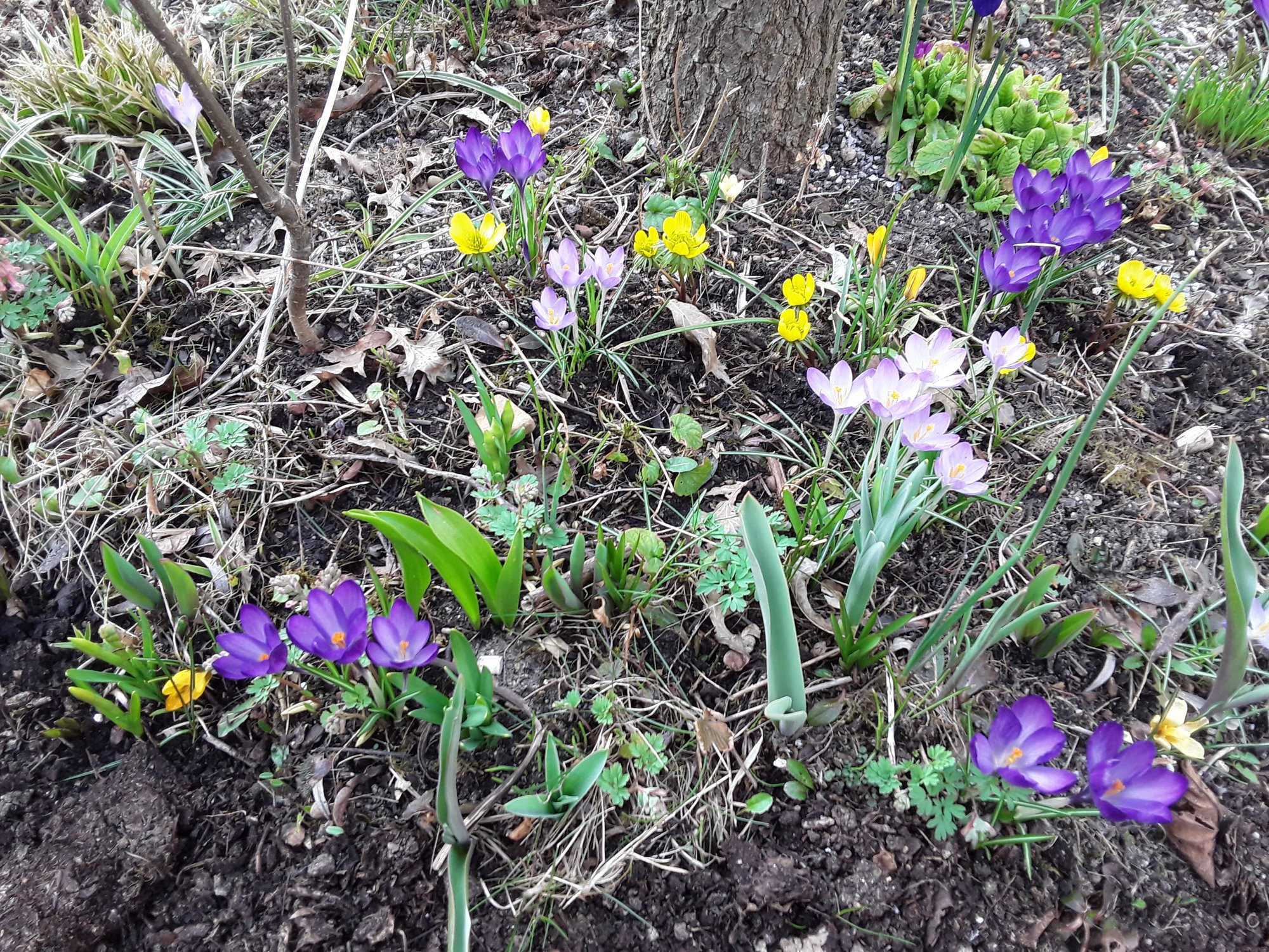 Ich überlege jedes Jahr, ob ich diesen extrem üppigen Pulk mit 'Carlton' im Hangbeet etwas besser verteilen soll, aber irgendwie ist's ja auch ein Hingucker, also bleibt erstmal alles so, wie es ist. Die 'Tête-à-Tête' unter der Haselnuss werden nicht wirklich mehr, aber sie halten sich gut und zaubern einen netten gelben Teppich mit Blütensternen an diese Stelle, wo sonst kaum etwas wachsen will. Wahnsinnig üppig geworden ist auch das Lungenkraut unter Hamamelis 'Jelena', erst letztes Jahr gepflanzt, sind die im Garten gesammelten Sämlinge bereits richtige Büsche geworden, die über und über blühen. Die Baumscheibe um meine kleine Fothergilla ist erstmal mit ein paar Alibi-Krokussen bestückt, hier muss ich mir noch eine Unterpflanzung überlegen.