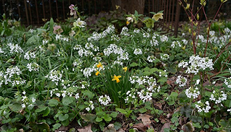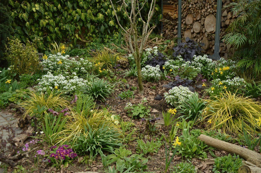 Heute kann ich auch mal wieder was zeigen. Mein Weißdornbeet. Schneeglöckchen und Märzenbecher sind schon durch. Die dunklen Helleboren haben dieses Jahr leider wenig Blüten. Dafür schäumt Pachyphragma und den gelben Narzissen geht es auch gut. Überall tauchen Primeln auf.
