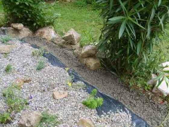 Mit Feldsteinen habe ich viele laufende Meter Beetkanten. Das sieht am Anfang Klasse aus. Da aber bei mir fast alle Beete an Rasen angrenzen, wird es sehr schnell unordentlich. Aus den Ritzen der Steine wächst hohen Gras, meist noch besonders üppig da die Wurzeln schön kühl sind. Mit der Schere fast nicht abzuschneiden, mit dem Trimmer auch schwierig. Meine Schwiegermutter hat schon zweimal überall die Steine zurückgeklappt und alles mit Stumpf und Stiel ausgerissen, hat allerdings nur einige Wochen gehalten. Wir haben uns jetzt in einem nahe gelegenen Steinbruch einigermaßen gleiche Steine besorgt und angefangen, die Beetkanten "rasenmähergerecht" zu verlegen und gleichzeitig z.B. an der Terasse Folie unter den Kies zu legen. Auf diesem Bild sieht man die alten Steine und das Mörtelbett für die Neuen.