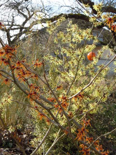 Sie wurde mal niedrig eingestuft, da sie manchmal die Blätter bis zur Blüte hält, aber bei mir hat sie das nur im Jugendstadium gemacht: Hamamelis mollis 'Sunburst'.