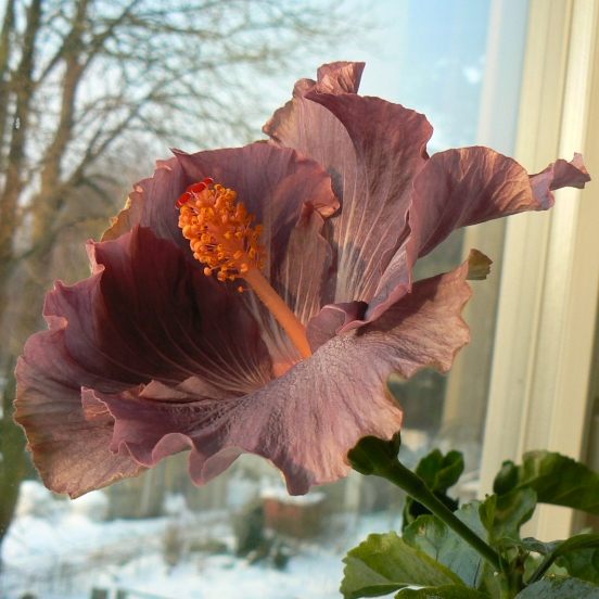 In Laufe eines Gartenjahres gibt es ab und an auch Wiederholungen. Deshalb kehre ich heute zum allerersten Star des Tages zurück. Tylene hat auch diesen Winter zwei Knospen gegen die obligaten Spinnmilbenattacken verteidigt. Sie hat sich sehr viel Zeit gelassen, ich glaube die Anlagen dazu waren schon da, als ich sie im Herbst reingeräumt habe. Heute früh öffnete sich die erste Blüte - in diesem wunderbaren graulila Farbton und beschienen von den ersten Sonnenstrahlen seit zweieinhalb Wochen überhaupt.