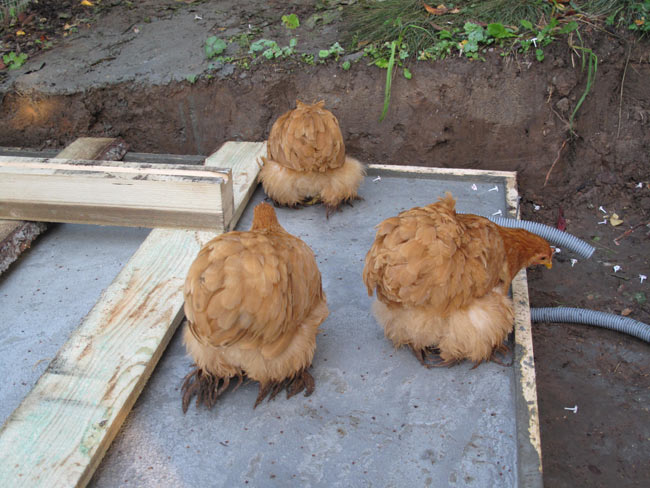 Wenn man von den Baustellen absieht... :PHier sind die Hühner bei der Inspektion eines Fundaments.Schöne Hühner in einem schönen Garten!