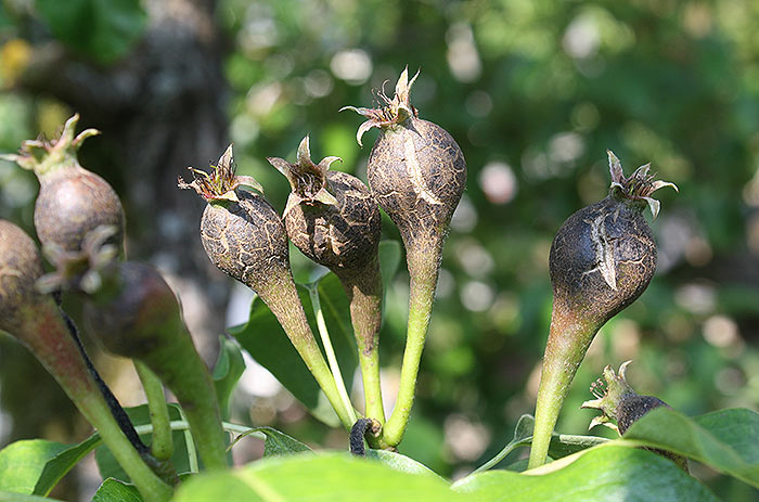Conference ist zu 100% betroffen, die vier anderen Sorten teilweise bis gar nicht. Am wenigsten die "Frühe von Trevoux". "Stuttgarter Gaisshirtle" hab ich mir noch nicht angesehen.Die Birnen werden auch nichts mehr, die Risse und Narben in diesem frühen Stadium machen das Fruchtfleisch steinzellig und holzig. Mal sehen, was der Baum in den nächsten Wochen von selbst abwirft, ich werde den Rest nochmal kräftig reduzieren damit der Blütenansatz nächstes Jahr gut ist, wie Apfelfreund bereits vorgeschlagen hat.