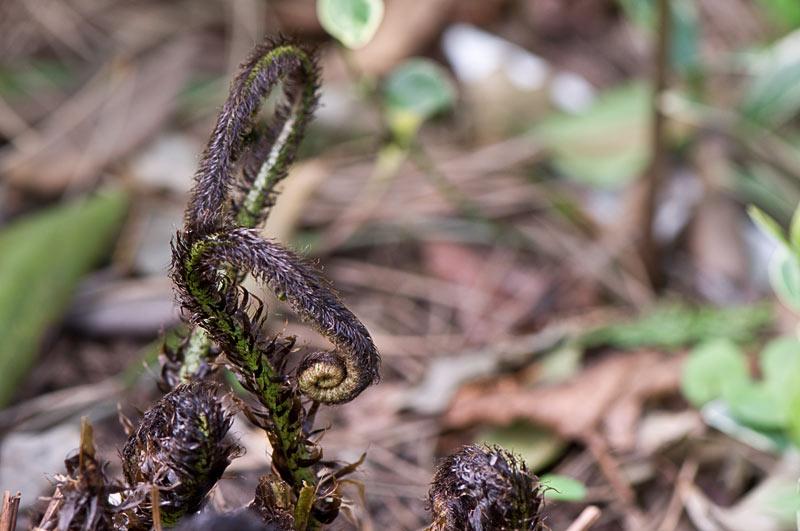und der Elefantenrüsselfarn Dryopteris atrata rollt seine Rüssel aus.