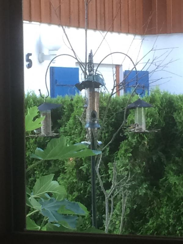 Wäre es noch denkbar, dass der Grünfink durch das Fressen , vielleicht auch Quetschen der blauen Felsenbirnenfrüchte seine Vorderfront etwas besudelt hat und sich sein Gefieder deshalb etwas verfärbt hat. Immerhin ergibt Grün + Blau beim Mischen einen rötlichen Ton, wenn ich mich richtig erinnere.