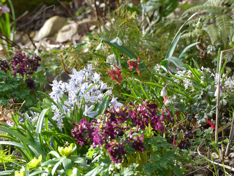 Letztes Jahr etwas "verunglückt", da der rosafarbene Schneeglanz erst neu gesteckt war und daher mit dem gelben farnblättrigen Lerchensporn blühte, passt es dieses Jahr mit den Farben besser, da letzterer noch nicht so weit ist.