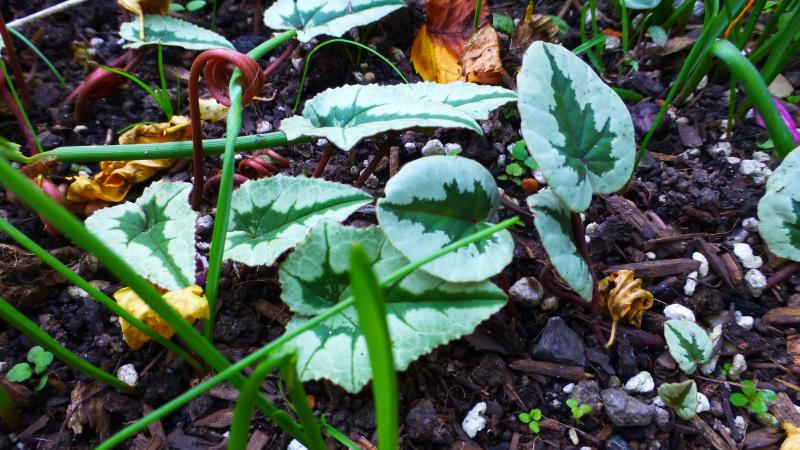 Bei dem vielen Regen in der vergangenen Woche haben die Schnecken wirklich überall im Garten ihr Unwesen getrieben und leider auch die silberblättrigen Cyclamen gefunden.