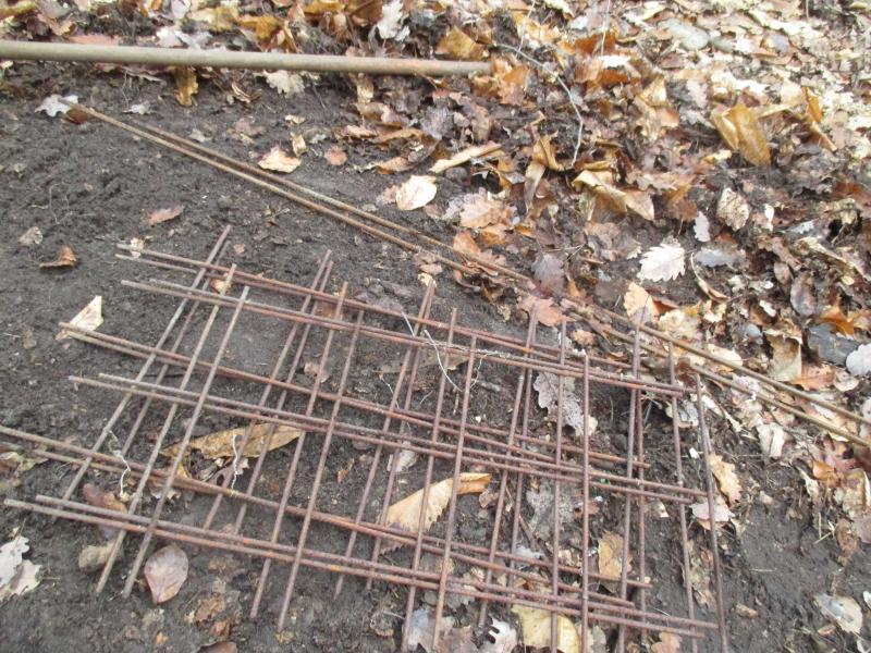 Erst werden die zurechtgeschnittenen Stücke der Baustahlmatte in den Waldboden eingeklopft.