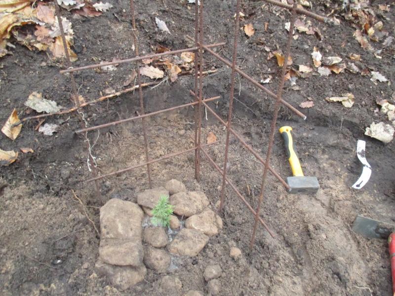 Die Baustahlmatten sind etwa 20 Zentimeter tief im Boden. Das reicht bei dem kleinen Käfig aber nicht gegen ein Wildschwein. Darum werden zwei Amierungseisen etwa 1 Meter tief in den Boden gehauen und der Käfig daran befestigt.