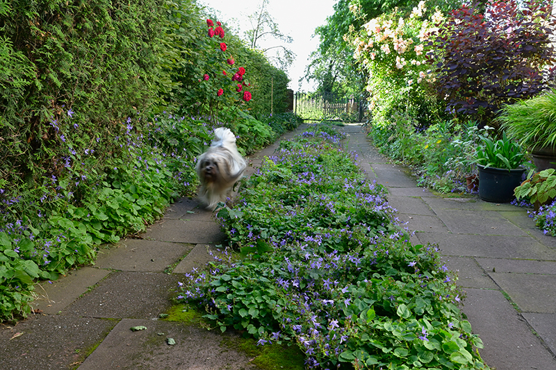 Die Einfahrt ist 60 Jahre alt und nie neu gepflastert worden. Ein Sorbus, von dem man sagt, dass er nichts hochkommen lässt außer Pflasterplatten, stand sehr lange am Rand ;D also die Fugen sind breit. Ich habe nichts gepflanzt, alles hat sich selber angesiedelt. Leider haben die spanischen Gänseblümchen im Winter schwer gelitten und werden jetzt von den Glockenblumen nieder gemacht.