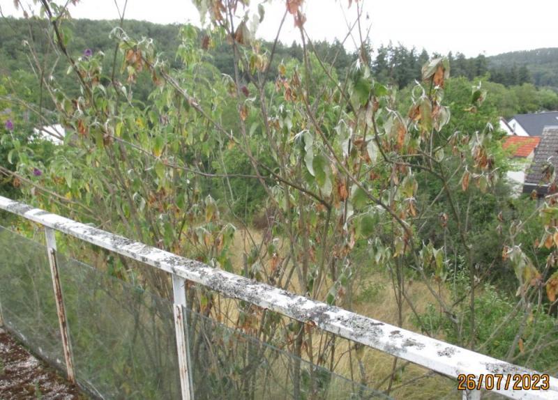 Seit Ende Mai wird bis auf eine Woche Pause durchgegossen. Seit etwa zwei Wochen zieht zusehens der Herbst ein; die Blätter vertrocknen und rieseln zu Boden. Ein Bild spricht mehr als viele Worte...