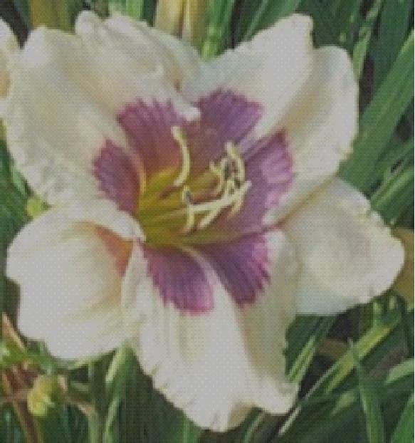 Und so sieht die Blüte aus! Bin gespannt, was man (u.a. auch bald ich) damit noch so anstellen kann...SHINING EYES (Megan Skinner 1999)( (Siloam Ury Winniford seedling x If) 24" EM 4" Sev Dip Ext4", 24" light lemon with an intense lavender eyezone that is highlighted with violet pencil edge and lemon midrib, over yellow-green throat. EM, sev, extended, hardy, 23 buds, dip. This is a pretty garden flower that has proven to be an exceptional breeder. It multiplies much faster than any of our other seedlings or introductions. In fact, it’s the first small dip that could be described as semi-invasive, edging out less-hardy neighbors as the clump spreads. It combines the northern-hardy Henry line with the fancy-eyed IF from Ra Hansen.SHINING EYES got its name because it was the first of our seedlings in which the eyezone when viewed at an angle looks metallic because of the way it reflects light. This iridescence only appears about a quarter of the time, but we have gotten the trait to show more intensely and more consistently in its seedlings. This daylily is a must for hybridizers seeking vigorous, northern-hardy diploids. Very pod fertile, though pollen sterile, and an excellent parent. As we evaluated our seedlings from the past three years, SHINING EYES was a parent of all of the metallic-eyed dips and also the parent of most of the hardy and vigorous "blue-eyed" dip seedlings.