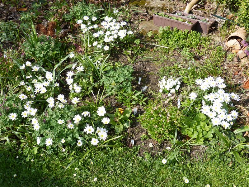 Im Herbst 2015 habe ich 25 Knöllchen von A. blanda 'White Splendor' versenkt. Letztes Jahr trieben sie schon kräftig aus. Das wurde mir zuviel in dem Beet und ich entfernte einen guten Teil wieder. Das half nicht wirklich, denen scheint es bestens zu gefallen. Das Foto ist etwas stark besonnt.