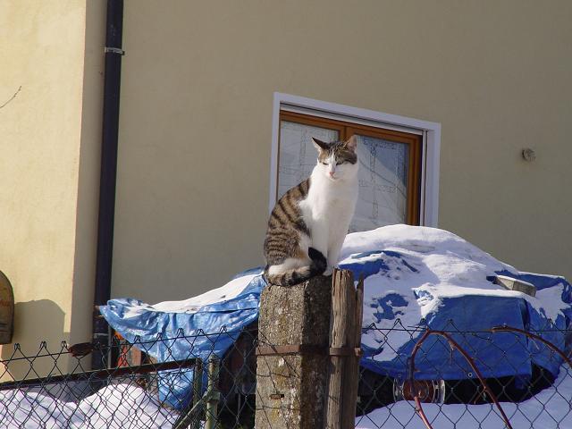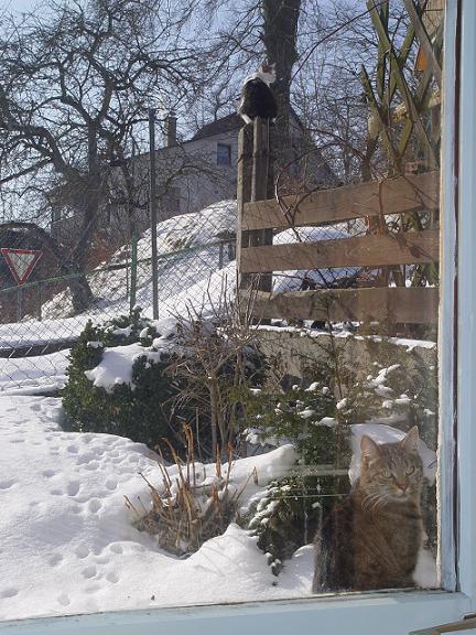 Felix, der Rebell, liebt es, alles im Überblick zu haben, weshalb sich der Zaunpfahl hervorragend als Beobachtungsposten eignet.Balu dagegen richtet seine Sinne lieber auf das, was Zuhause vor sich geht.