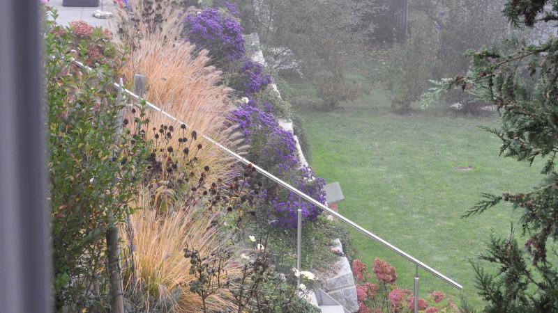 Blick aus dem Badezimmerfenster auf das Nachbargrundstück. Der jetzt bepflanzte Hang, da lagen vorher viele, viele Steine rund ums ganze Haus. Dann stand das Haus sicher ein Jahr leer und die Unkräuter siedelten sich zwischen den Steinen an, das war spannend zum Zuschauen, fast schon schade, als die Bagger zur Gartenrenovierung einfuhren. ;)
