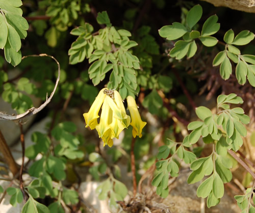 Ein grosser Horst von Corydalis lutea an einer Mauer vor dem Haus hat praktisch durch den ganzen Winter geblüht. Die kleinere Schwester an der Terassenmasuer ist jetzt vom Winterschlaf aufgewacht.