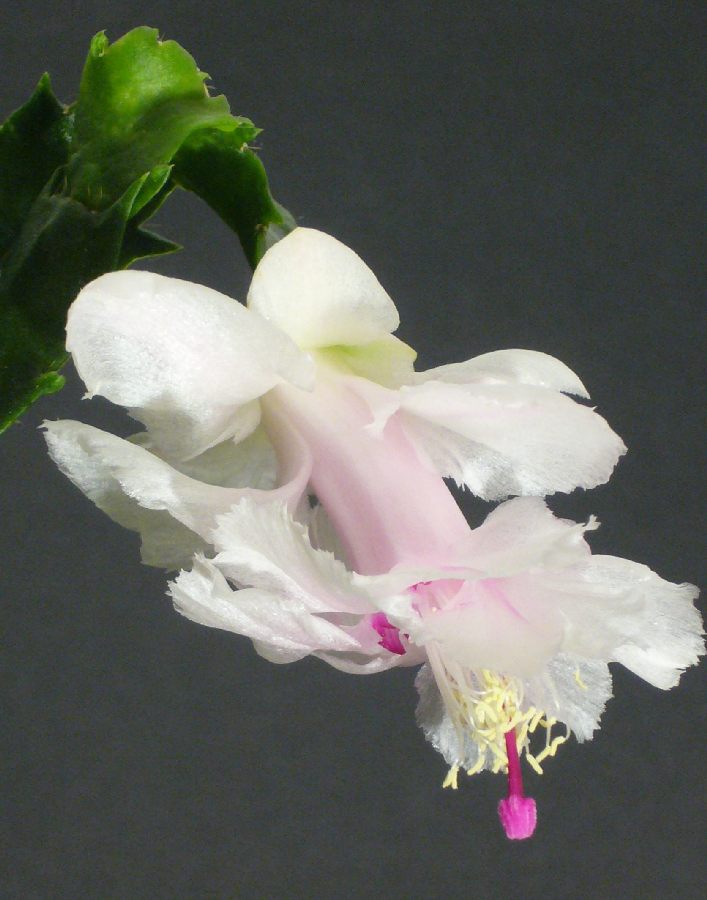 Hallo,dieser erstmals blühende Steckling von einer über dreissigjährigen Mutterpflanze könnte eine alte Hybride aus Sch. x buckleyi X Sch. truncata sein (evtl. die alte Sorte ´Sonja´). Die Glieder bekommen lediglich 2 kleine Spitzen an der Seite des Blütenansatzes.