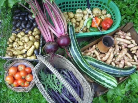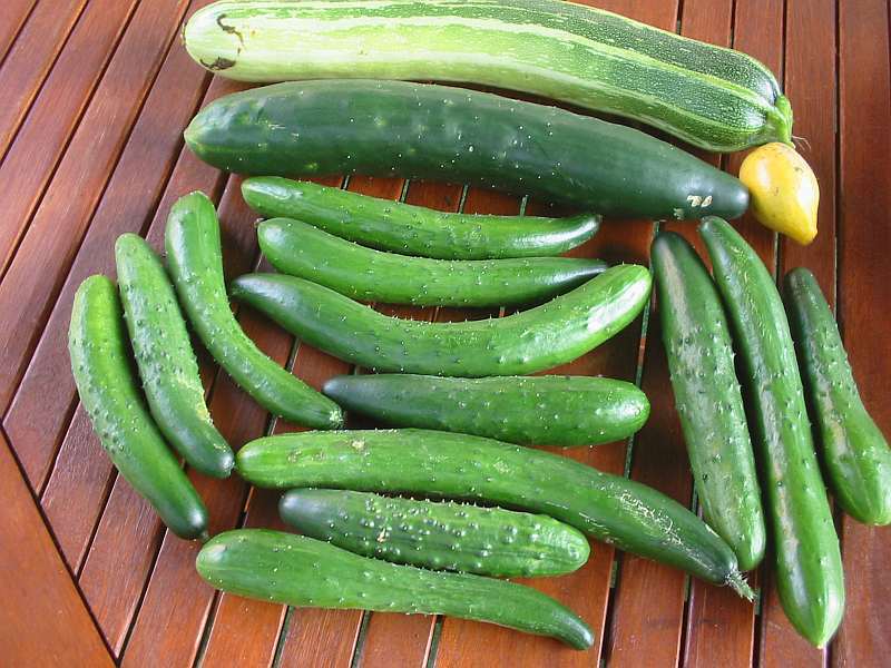 Conni, die langen, dünnen Salatgurken in der Mitte des letzten Erntebildes sind Burpless Tasty (Saat gut von Quedlinburger).