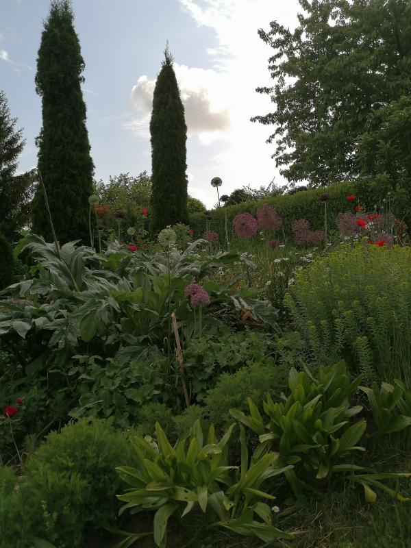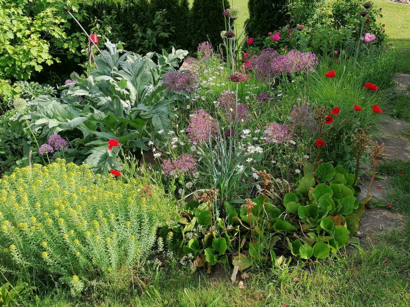 Momentan dominiert überall Allium. Diverse. Mohn und Margeriten sind von allein dazugekommen. Kardy explodiert und nimmt viel unter sich ein.