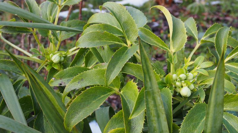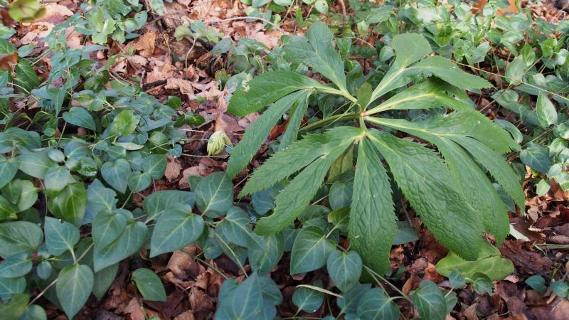 Helleborus argutifolius ist ganz gut über die Frostperiode gekommen und hat noch grünes Laub, bisher.