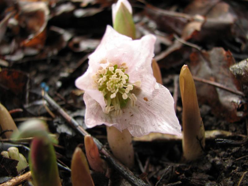 Die Blüten von Helleborus liguricus (geöffnet, gerade mal 10cm über der Erde) sind diese Woche wieder wie Phönix aus der Asche aus dem Schnee aufgetaucht. Als wäre nichts gewesen. Auch H. torquatus blüht