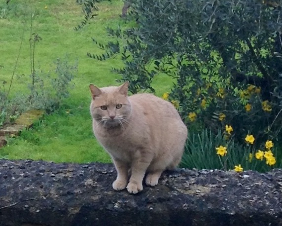 Nachbars Kater "Leo" besucht mich oft im Garten und manchmal kraxelt er über den Feigenbaum auf die Mauer
