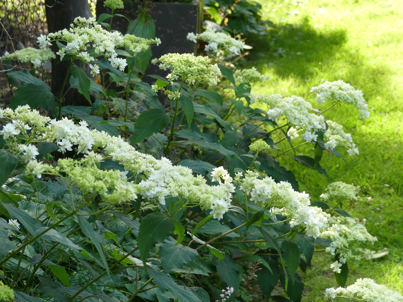 Inzwischen ist sie so groß, dass sie als Hortensie gerne mal übersehen wird. ;D Hydrangea aspera macrophylla, daneben H. paniculata 'Limelight'. Ich denke über's Aufasten nach.