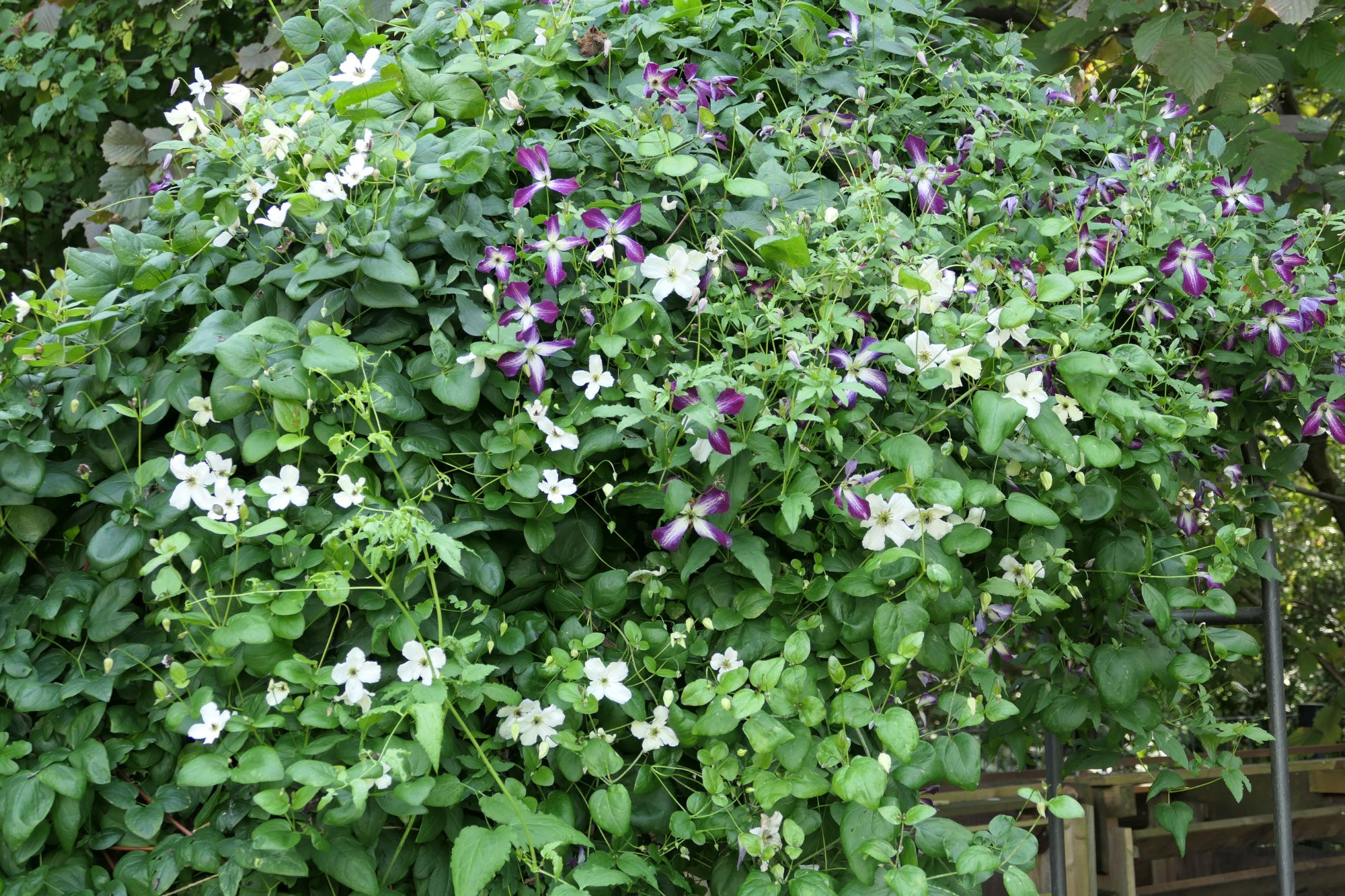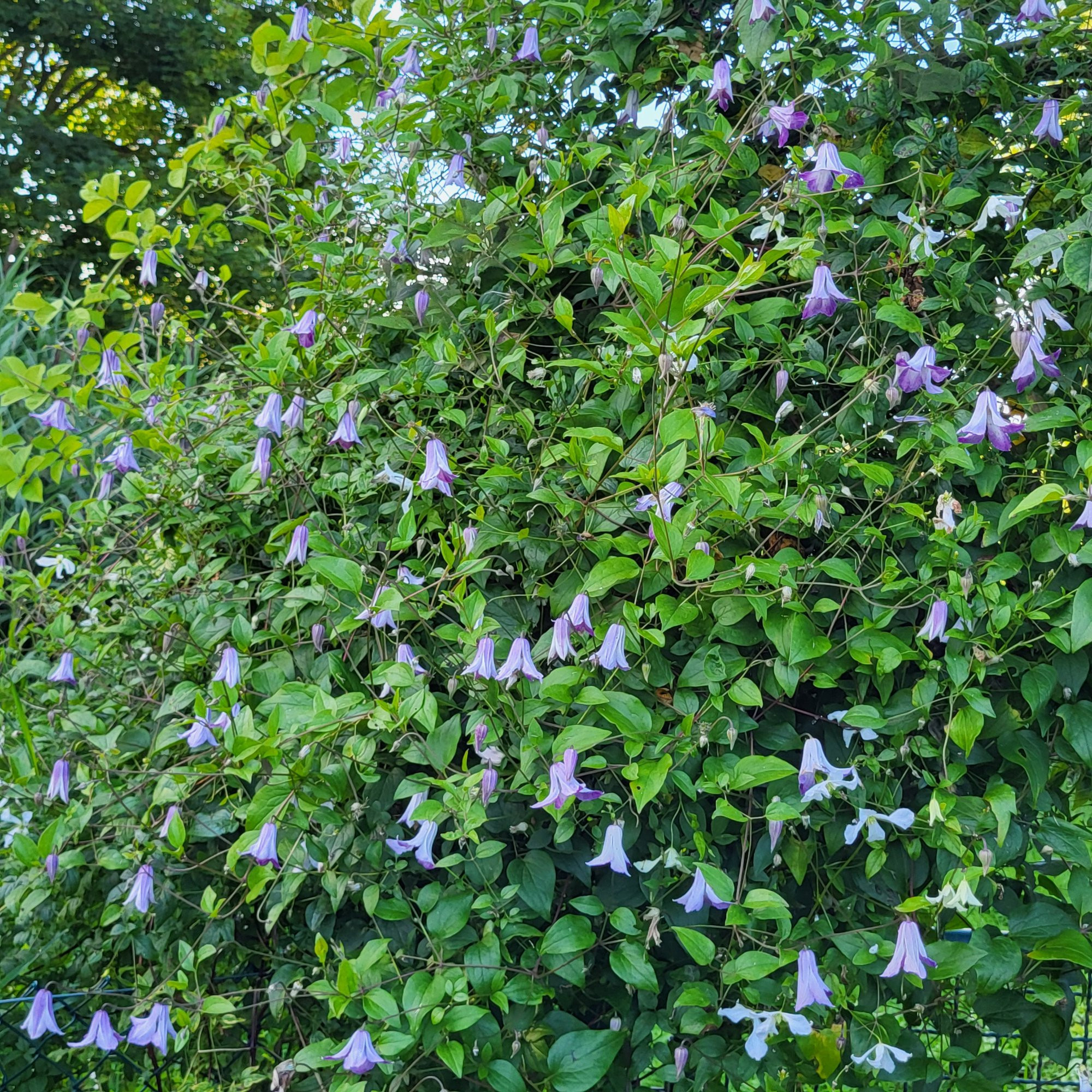 Als besonders empfehlenswerte weiße Clematis hat mir Herr Westphal mal die "White Prince Charles" empfohlen, die realistisch wohl bei 2,50 m liegt. Bei uns hat sie leider das 1. Jahr nicht überlebt. Sie soll aber robust sein. Ich würde auf jeden Fall die "Alba Luxurians" wählen, mega üppig, super robust und reichblühend wie kaum eine andere. Okay, sie hat grüne Ecken und kann zu Beginn der Blütezeit auch ganz grüne Blüten schieben, aber ich finde sie bezaubernd. Eine meiner erklärten Lieblingsclematis. Letzten Herbst habe ich uns die Viticella "Luxuriant Blue" gegönnt, eine Tochter von "Alba Luxuriant", das andere Elternteil ist "Venosa Violacea". Sie gibt bereits im ersten Jahr Gas und blüht unermüdlich.