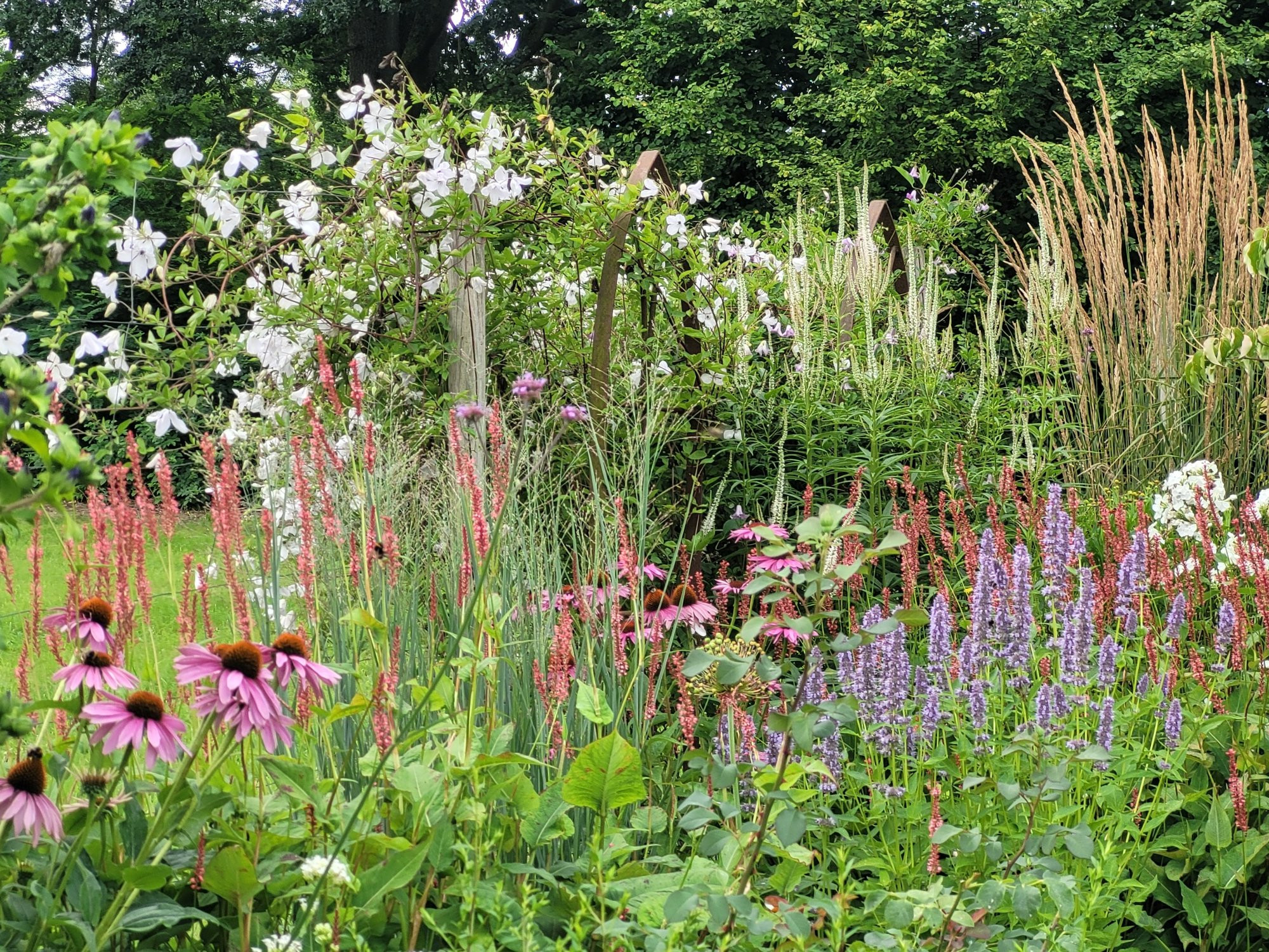 Huldine hat zwar größere Blüten, überwuchert aber alles andere.