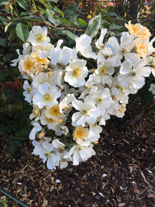 In diesem Jahr gibt es bei vielen eigentlich einmalblühenden Rosen eine Nachblüte. Diese Wildrosenhybriden gehören dazu.