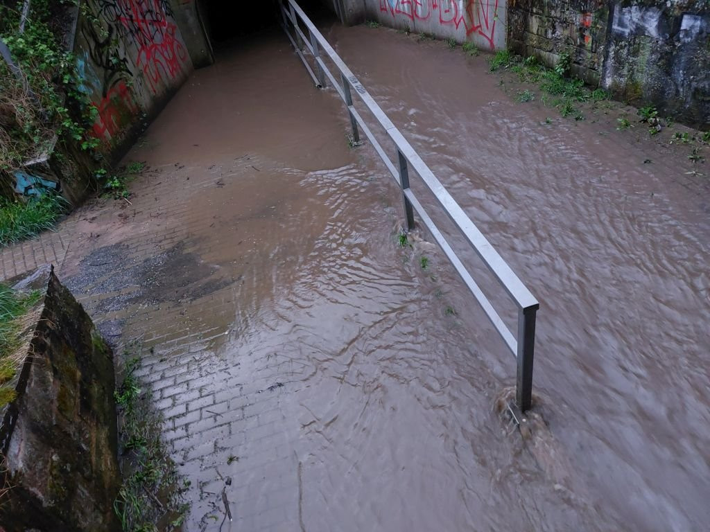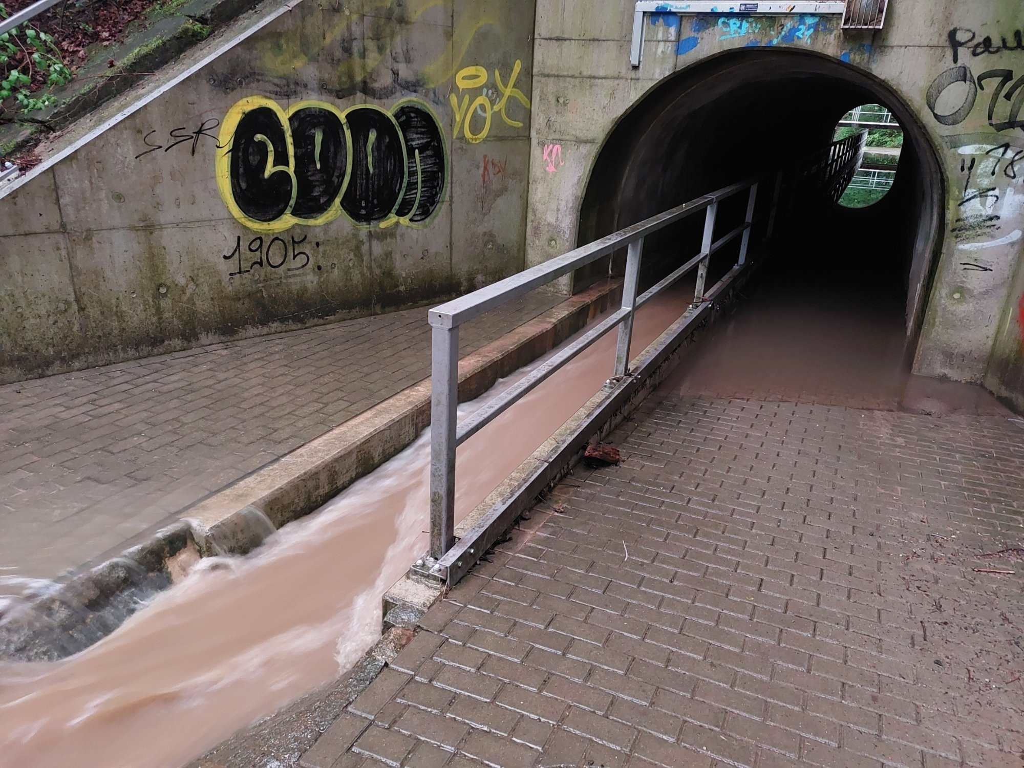 Schon interessant, wie regional unterschiedlich es dann offenbar gerade ist. Hier wieder Überschwemmung. Dieser Tunnel ist allerdings auch eine echte Fehlkonstruktion seit der Sanierung. Man hat nämlich den Fußweg abgesenkt unter das Niveau des Baches. Wahrscheinlich um irgendwelchen baulichen Vorschriften bzgl. der Durchgangshöhe zu entsprechen. Am unteren Ende kommt dann ein Gulli, das Gitter gefühlt so groß wie ein Duschablauf. Kein Wunder, dass das nicht funktioniert. Ergebnis: Man kommt nach Regen nur durch, wenn man sich seitlich auf dem Geländer stehend durchhangelt. Je nach Wasserstand auf der unteren oder mittleren Ebene.