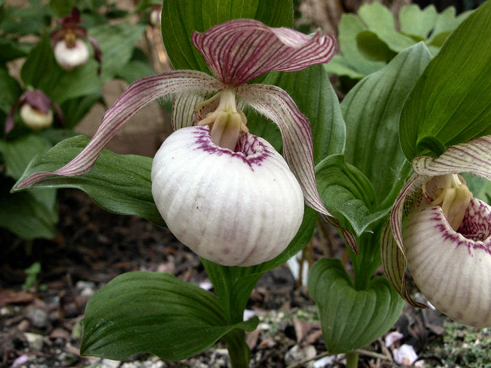 ; daneben eine weißer cyp. macranthum. wenn man genau hinguckt...hinter dem stängel des macranthum spitzen grad mal die cyp. reginae aus dem boden.