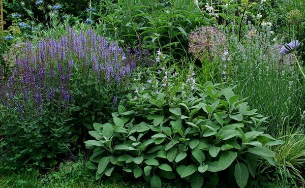Bei mir blühen gerade in dieser Ecke die Stauden, die es in jedem Gartencenter zu kaufen gibt, aber an denen ich mich trotzdem nicht satt sehen und riechen kann:Salvia officinalis BerggartenSalvia nemorosa BlauhügelGaura lindheimeri Whirling ButterfliesLavandula angustifolia Middachten (fängt gerade erst an)Scabiosa caucasica PerfectaCarex muskingumensis ( um den zu sehen, muss man schon ganz genau hinsehen)dazwischen stehen noch ein paar Alliumse und die Jungfer im Grünenleider miese Bildqualität