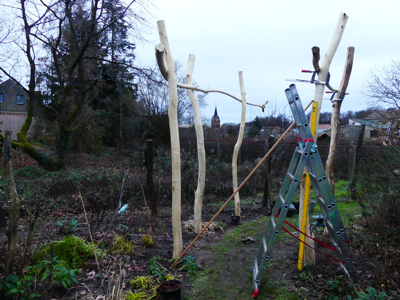 Heute schälte ich einen weiteren der gestrigen Stämme, der mit seinem gebogenen Wuchs verdächtig passend aussah, gleich am Stück an der Außenkurve der Pergola Verwendung zu finden. Und so war es dann auch. :) Ich konnte ihn einfädeln, als wäre er extra für diese Stelle gewachsen. Kurzerhand wurden Pfosten und Querhölzer durchbohrt, Gewindestangen durchgeschoben und fest verschraubt. Als das Licht alle war, konnte ich die letzte Mutter anziehen. Für ein letztes Foto war es dann schon nicht mehr hell genug, also noch ein Baustellenfoto. ;)