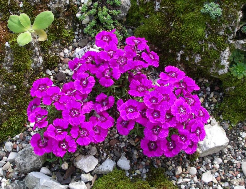 Bei mir nie einfach zu halten und auch nicht sehr langlebig sind die niedrigen alpinen Nelken. Hier Dianthus alpinus in der spektakulären Ausleseform 'Joans Blood'.