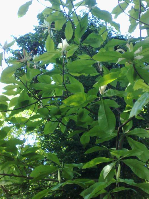 Magnolia tripetala .Leider sind die Blüten hoch oben und meine Digitalkamera hat kein Tele...(Nokia 95).Ich habe die unteren Äste entfernen müssen ,damit die Unterpflanzung nicht gestört wird.