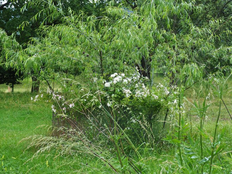 heute im Wiesengarten und plötzlich sind die Rosen alle da. Die in der Drahthose mit der Weide, Salix acutifolia 'Blue Streaks', gedeihen prächtig. Rosa Noisettiana 'Mme Alfred Carrière', Rosa multiflora 'Souvenir de Carmen Figueroa-Meyer' und Rosa multiflora 'Nana'. Die 'Souvenir de Carmen Figueroa-Meyer' ist eine Züchtung von Mark Brown.