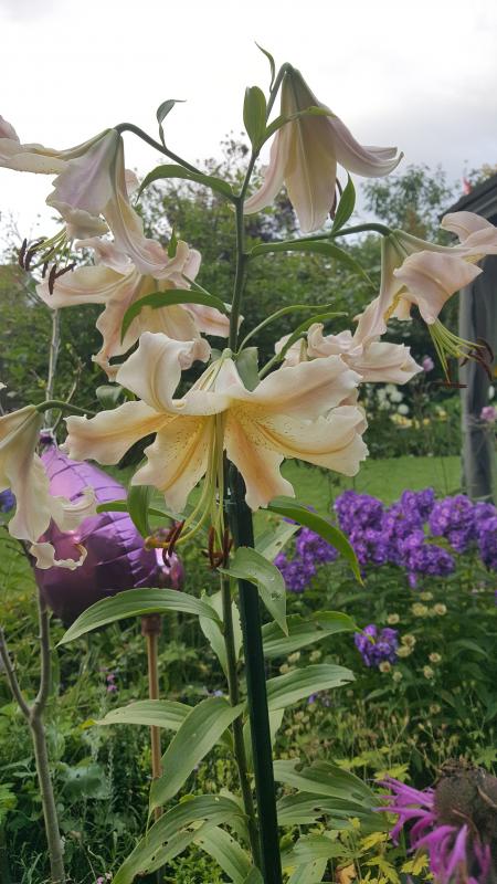 Bei uns weht auch ein schwerer Duft durch den Garten. Im Gartenmarkt wurden viele Lilien aus Baumlilien angeboten. Aufgrund ihres dicken Stammes bräuchte ich sie nicht stützen.