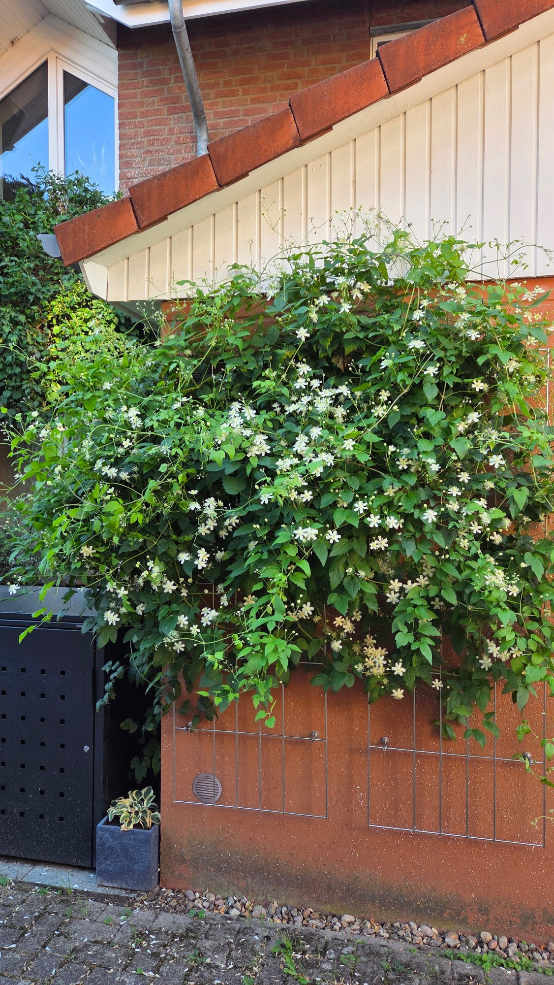 Wir haben sie um die Ecke gelenkt. Letztes Jahr lag sie auf den Mülltonnenboxen, dieses Jahr kann sie sich an zwei zusätzlichen Rankgerüsten austoben. Das scheint sie sehr zu motivieren
