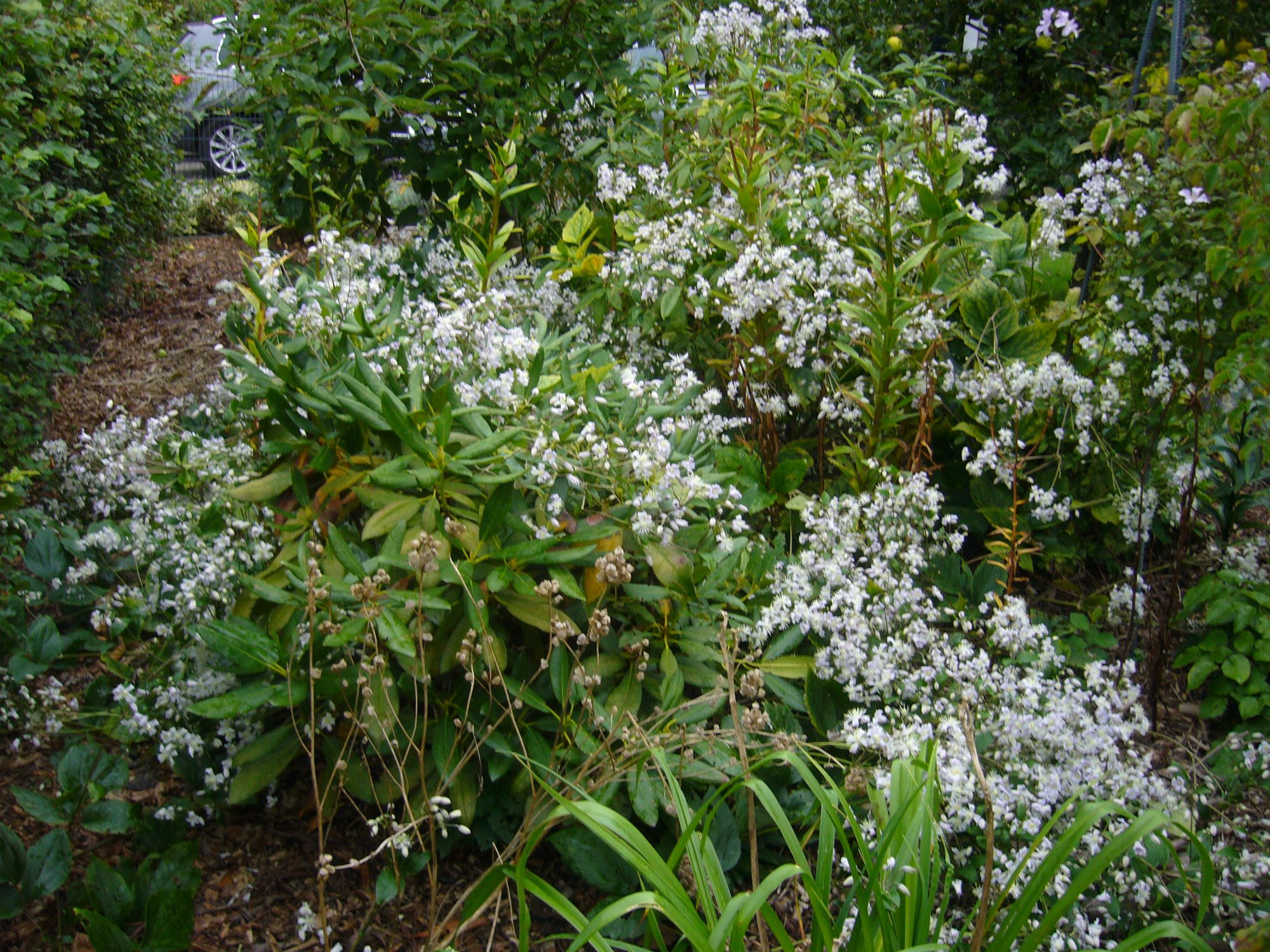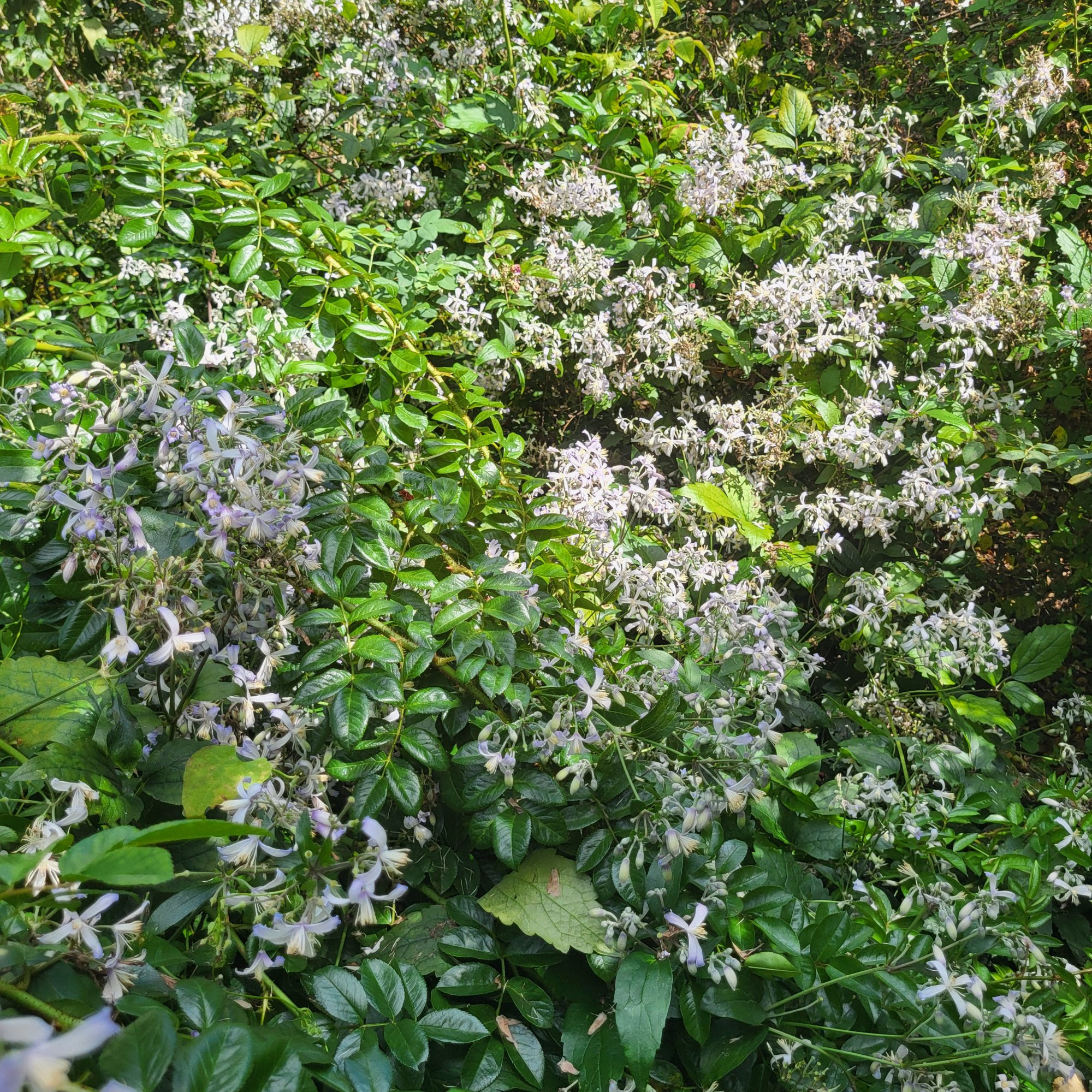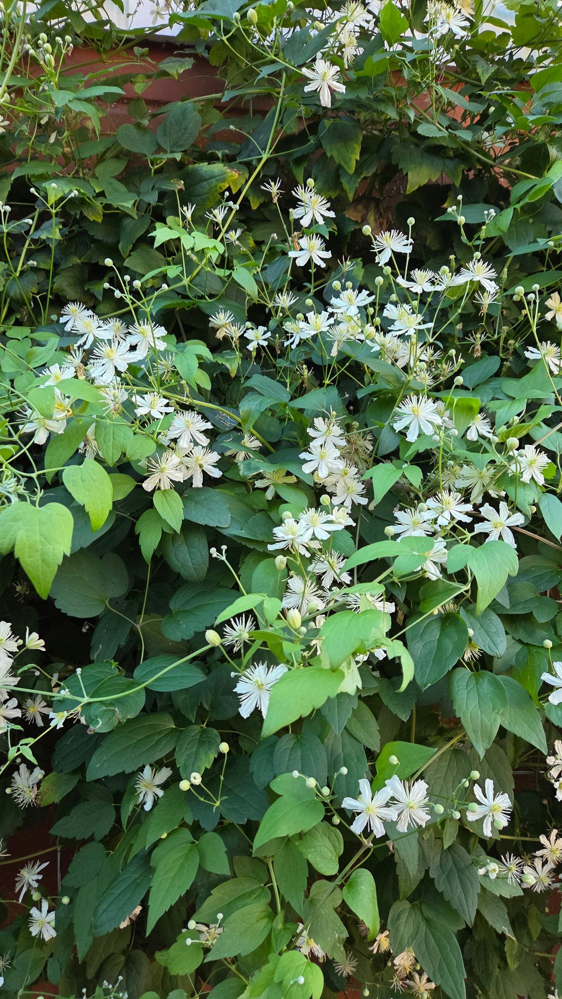 Unser sympathisches Monster Clematis fargesioides Syn. Paul Farges / "Summersnow". Sie schafft locker 5 m und ist auch an einem schwierigen Standort unkompliziert