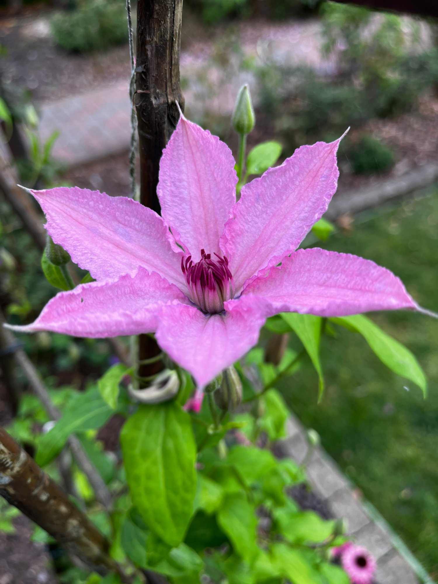Hier beginnt Hagley Hybrid mit der 2. Blüte, sie steht jetzt den 2. Sommer hier und legt langsam los.