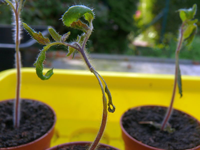 Bei einer Tomatensorte gibt es ein interessantes Schadbild. Es handelt sich wohl um die Umfallkrankheit, eine Pilzerkrankung die von Pythium, Botrytis, Fusarium oder Olpidim hervorgerufen wird. Verschärfend kam hier die hohe Luftfeuchtigkeit durch fehlende Belüftung in den eiskalten Nächten dazu. Jetzt haben wir den Salat. Die Umfallkrankheit soll nicht samenbürtig sein. Das kann ich mir kaum vorstellen bei meiner Einzelaussaat in neuen Töpfen und Aussaaterde von verschiedenen Herstellern mit immer dem gleichen Ergebnis. Jetzt läuft noch ein vierter Test.